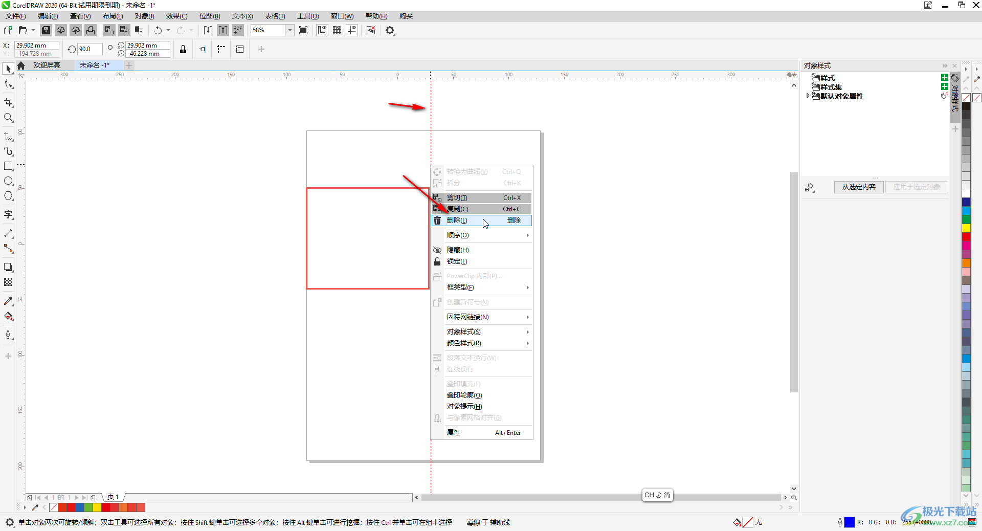 第五步:点击选中辅助线(变为红色即为选中状态),按delete键,或者右键点击一下后选择“删除”按钮就可以取消辅助线了。