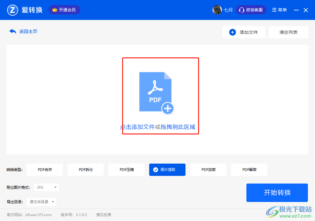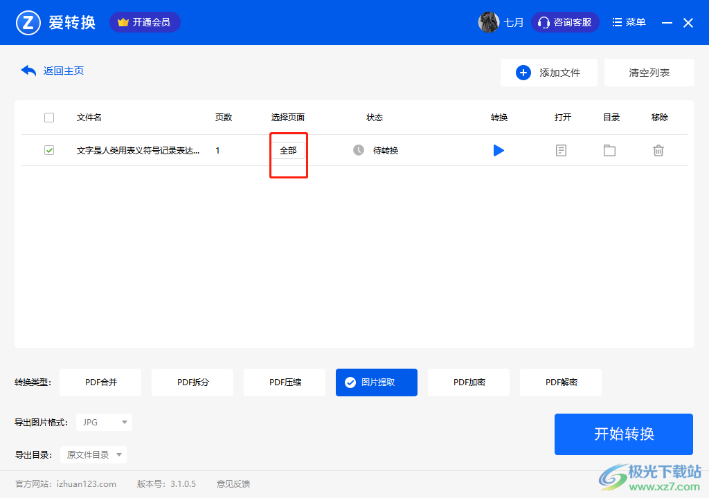 爱转换pdf转换器是一款专门用来处理pdf文件的转换软件,支持不同格式之间的转换,还针对pdf文件提供了压缩、合并、拆分或是图片提取等功能,为用户解决了许多的问题,带来了不错的使用体验,当用户想要将pdf文件中的图片提取出来时,就可以在爱转换PDF转换器软件中来操作实现,首先用户在软件主页上找到pdf功能板块中的图片提取选项,接着来到操作页面上选择需要的pdf文件,接着设置好导出的图片格式和导出图片路径, 随后选择好提取图片的页面后按下开始转换按钮即可设置成功,那么接下来就让小编来向大家分享一下爱转换PDF转换器提取pdf图片的方法步骤吧,希望用户能够喜欢。