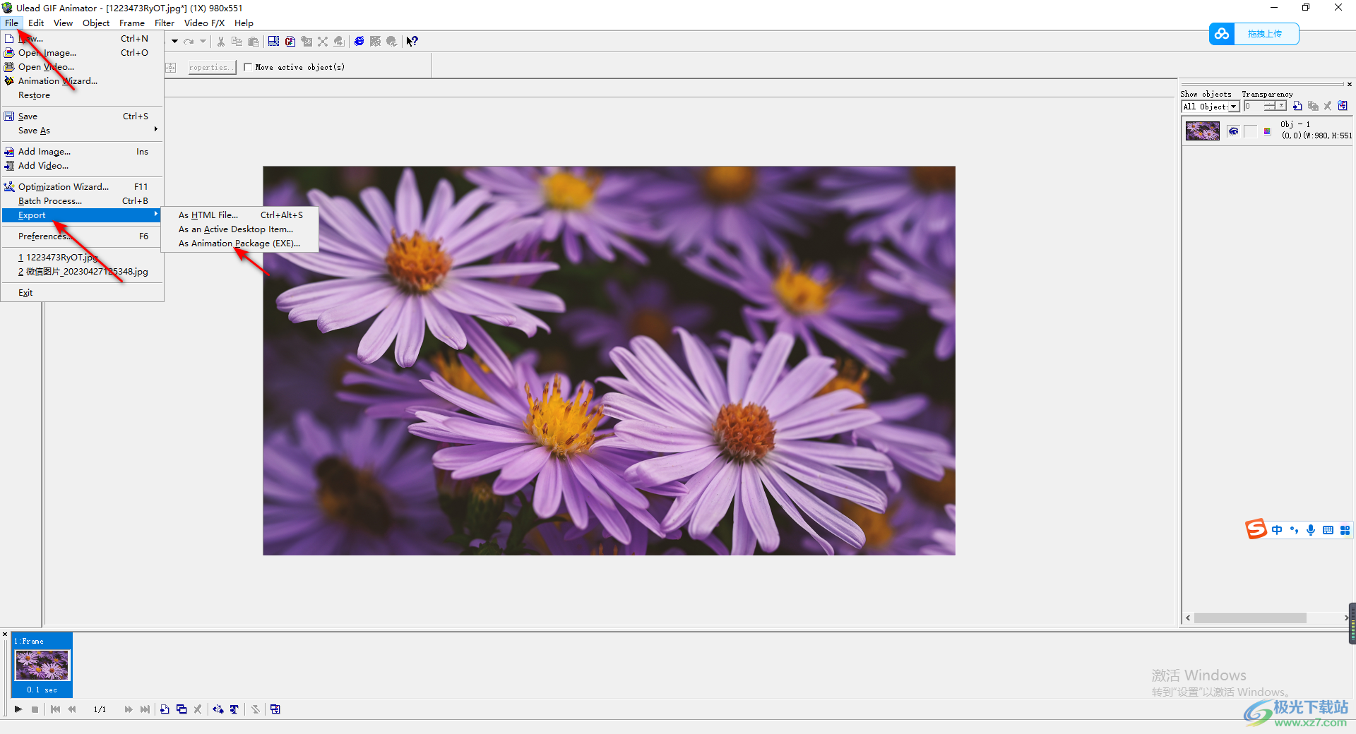 1.当我们制作好动图之后,点击左上角的【文件】选项,选择【导出】选项,再在子选项中选择第三个选项【导出动画包】。