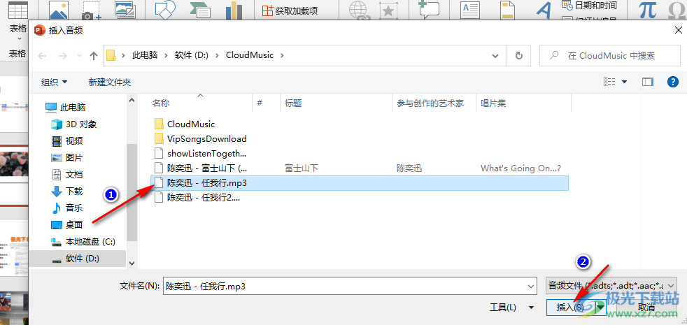 4、第四步,进入文件夹页面之后,我们在该页面中找到自己准备好的歌曲文件,然后点击“插入”选项