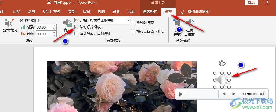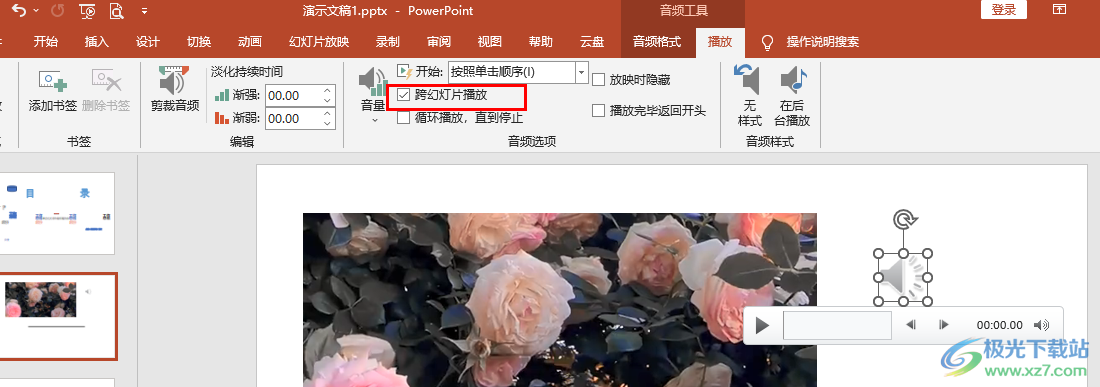 5、第五步,插入音频文件之后,我们点击音频文件,然后在“播放”的子工具栏中找到并勾选“跨幻灯片播放”选项,想要循环播放该歌曲时,我们直接勾选“循环播放,直到停止”选项即可