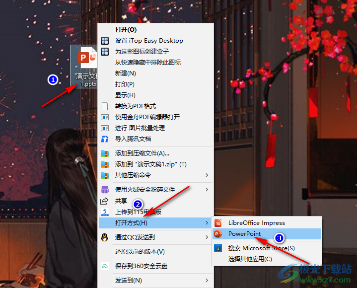 1、第一步,我们首先在电脑桌面上找到需要编辑的演示文稿,然后右键单击该文档,再在菜单列表中点击“打开方式”选项,接着在子菜单列表中点击选择“powerpoint”选项