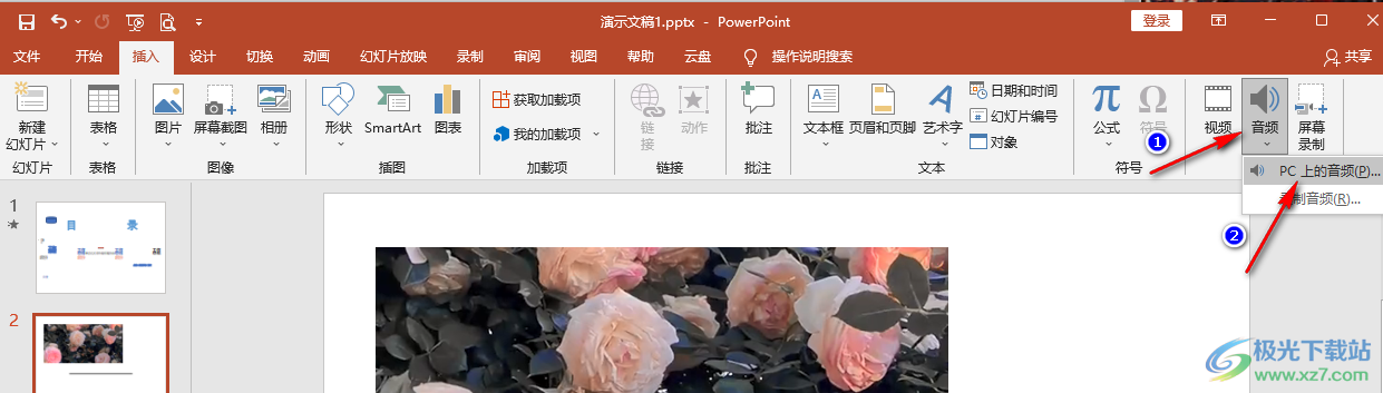 3、第三步,在“插入”的子工具栏中我们找到“音频”工具,点击打开该工具,然后在下拉列表中点击选择“PC上的音频”选项