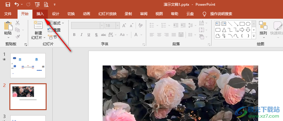 2、第二步,进入PPT页面之后,我们在该页面的工具栏中找到“插入”工具,点击打开该工具