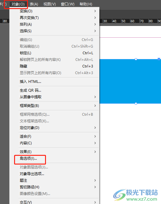 2.这时用户在页面上方的菜单栏中点击对象选项,在弹出来的下拉菜单中,用户选择其中的角选项