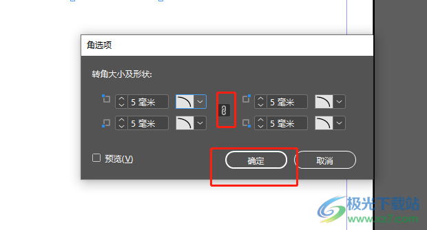 4.随后用户根据需求设置一下圆角大小并确保矩形的四个角都统一了设置,即四个转角都是圆角,然后按下确定按钮就可以了