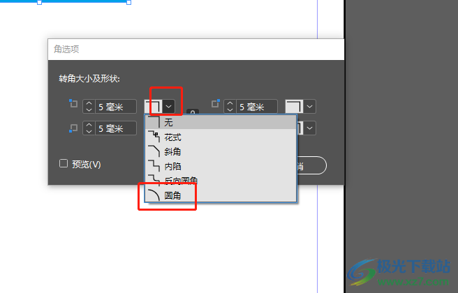 3.将会进入到角选项窗口中,用户点击转角形状的下拉箭头,在拓展出来的选项卡中用户选择圆角选项