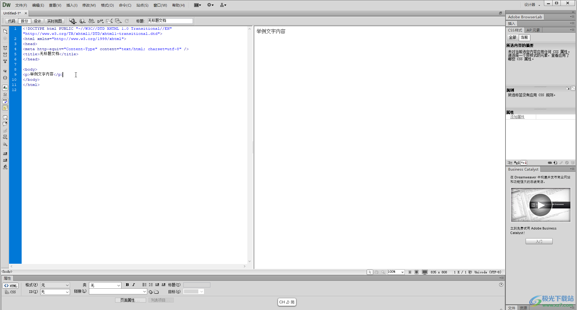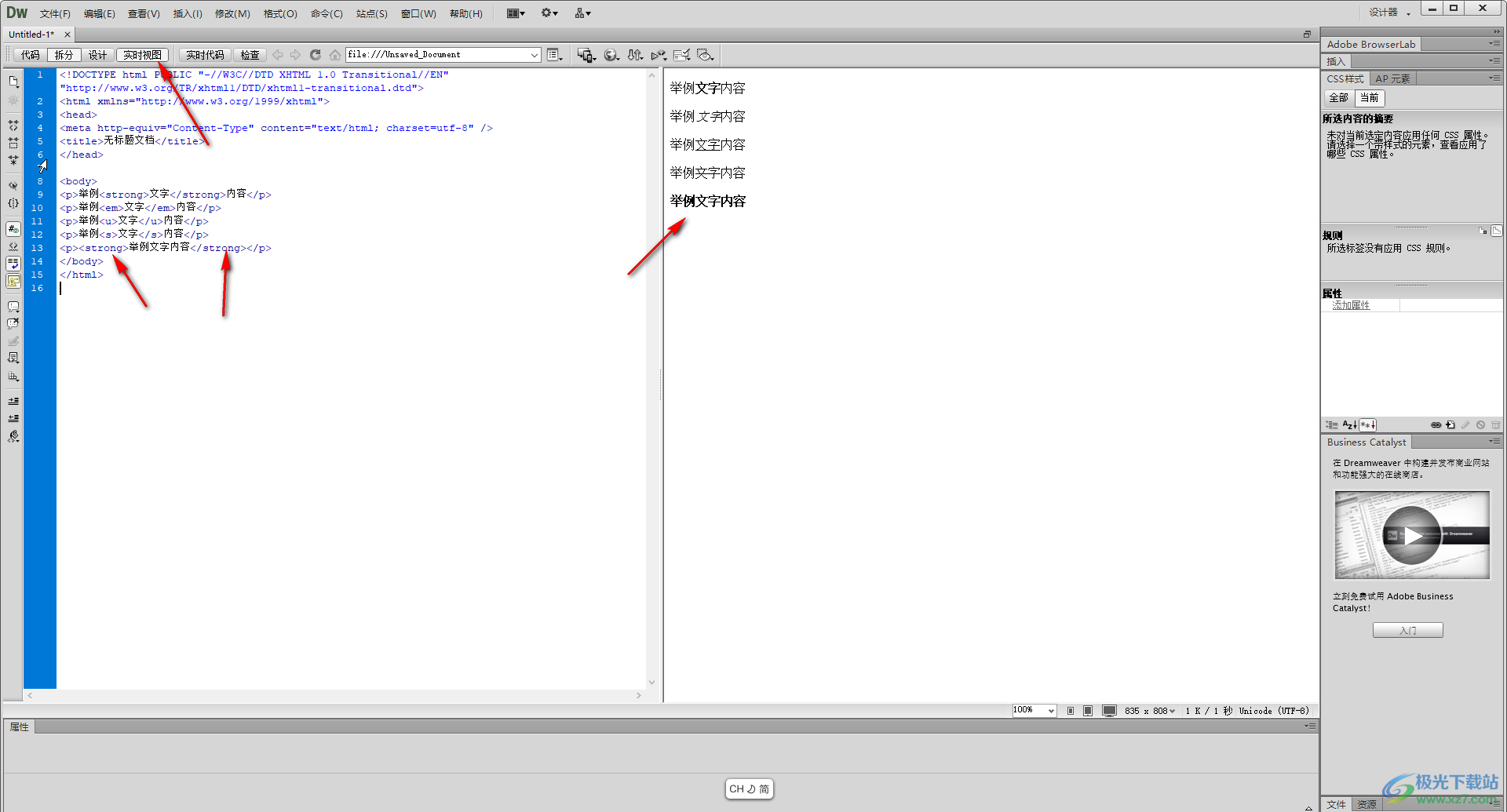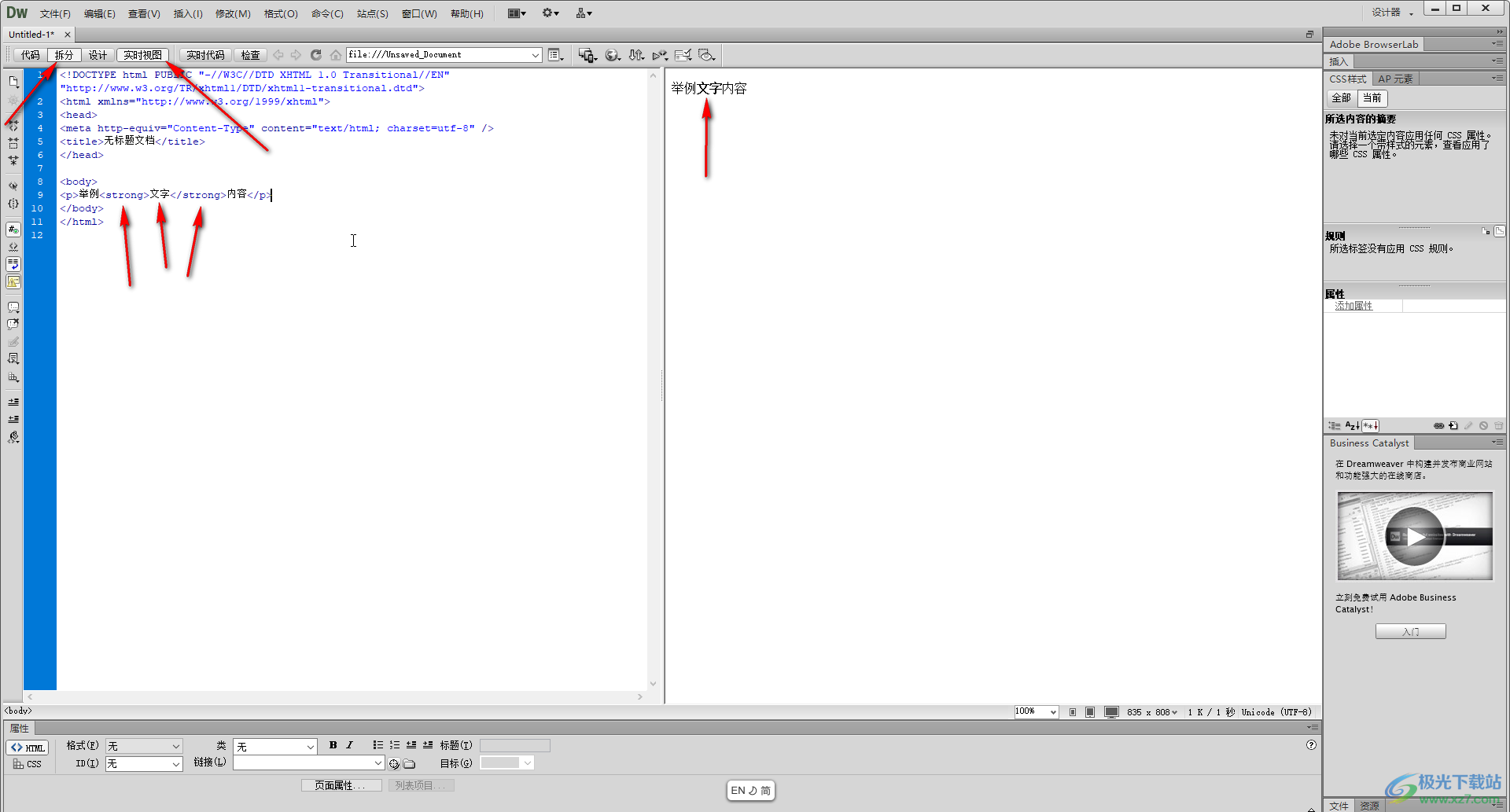 第二步:方法1.在body标签中输入P标签,然后输入需要的那位置内容,接着在P标签中输入strong标签,将需要加粗的文字放置strong标签中,在上方点击“拆分”视图,然后点击实时视图,就可以看到形影文字加粗显示了;