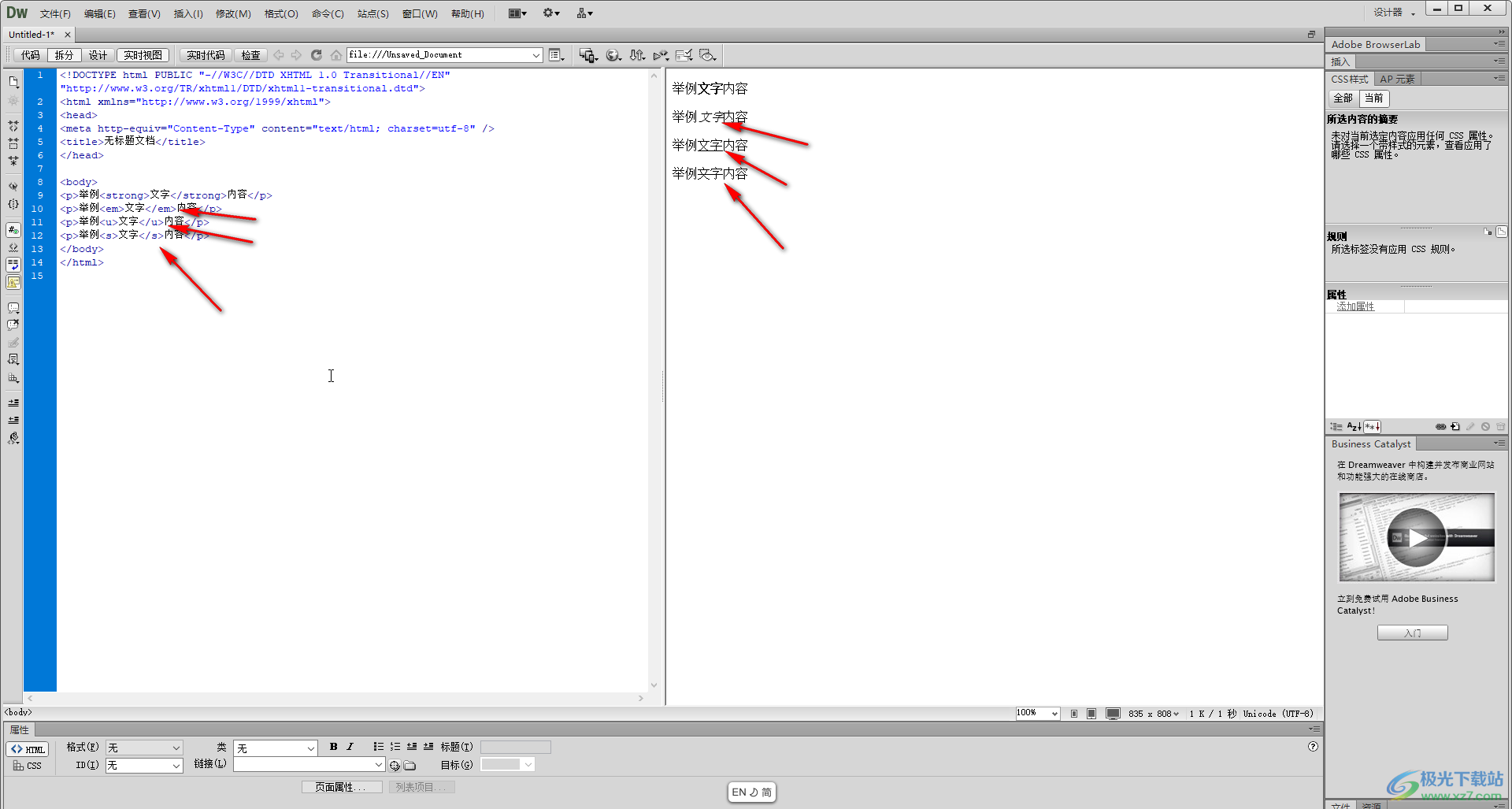 第三步:如果有需要,我们还可以在P标签中新建em标签设置斜体效果,新建u标签设置下划线效果,新建s标签设置删除效果等等;