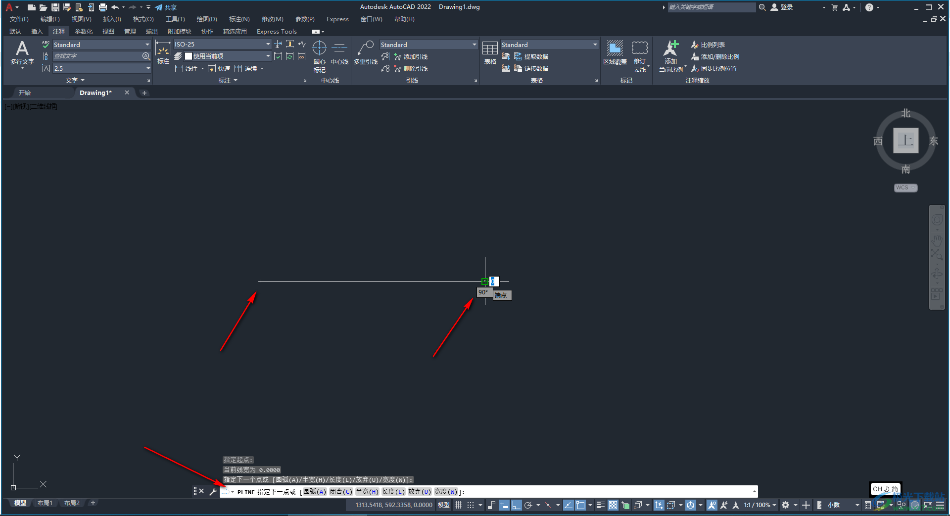 第三步:在下方输入命令处输入PL并按enter键,点击一个点作为箭头的起点,然后拖动鼠标左键绘制箭头的直线部分,绘制到需要的长度后再次点击鼠标左键得到箭头的线段部分;