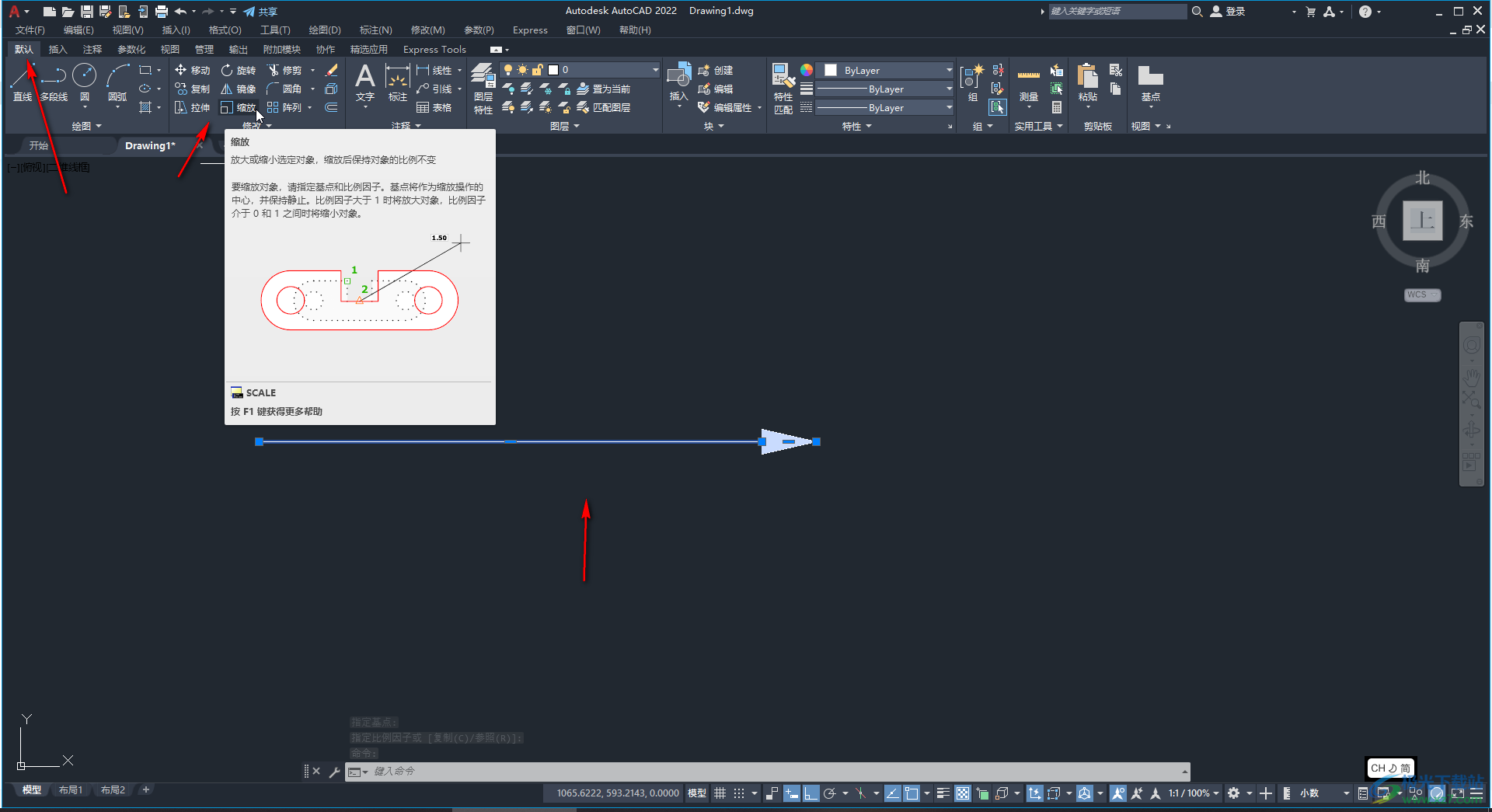 第五步:鼠标在十字状态时点击选中箭头,还可以在“默认”选项卡中使用“缩放”等功能调整箭头。