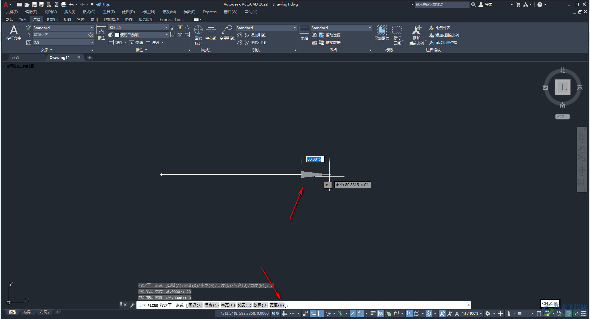 第四步:接着输入W键并按enter键,然后输入想要的箭头起始宽度,比如我们输入20,然后按enter键确认,接着箭头的终点宽度,这里输入输入0并按enter键确认,然后拖动鼠标左键调整想要的箭头大小,调到想要的大小后鼠标左键点击一下,然后按ESC键退出绘制状态就可以了;