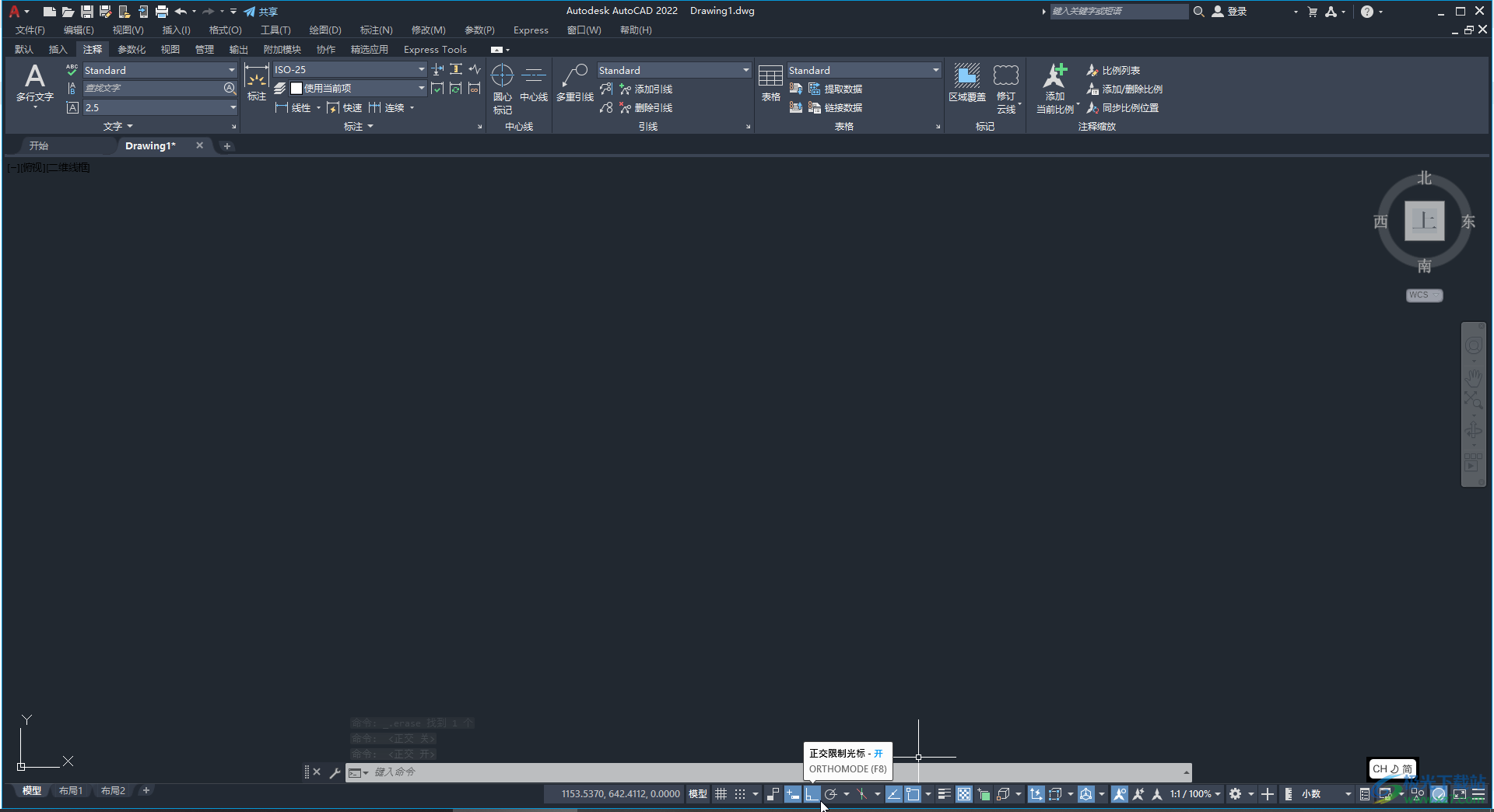第一步:点击打开autoCAD进入编辑界面,在界面下方点击如图所示的“正交限制光标”,看到出现颜色底纹表示开启成功;