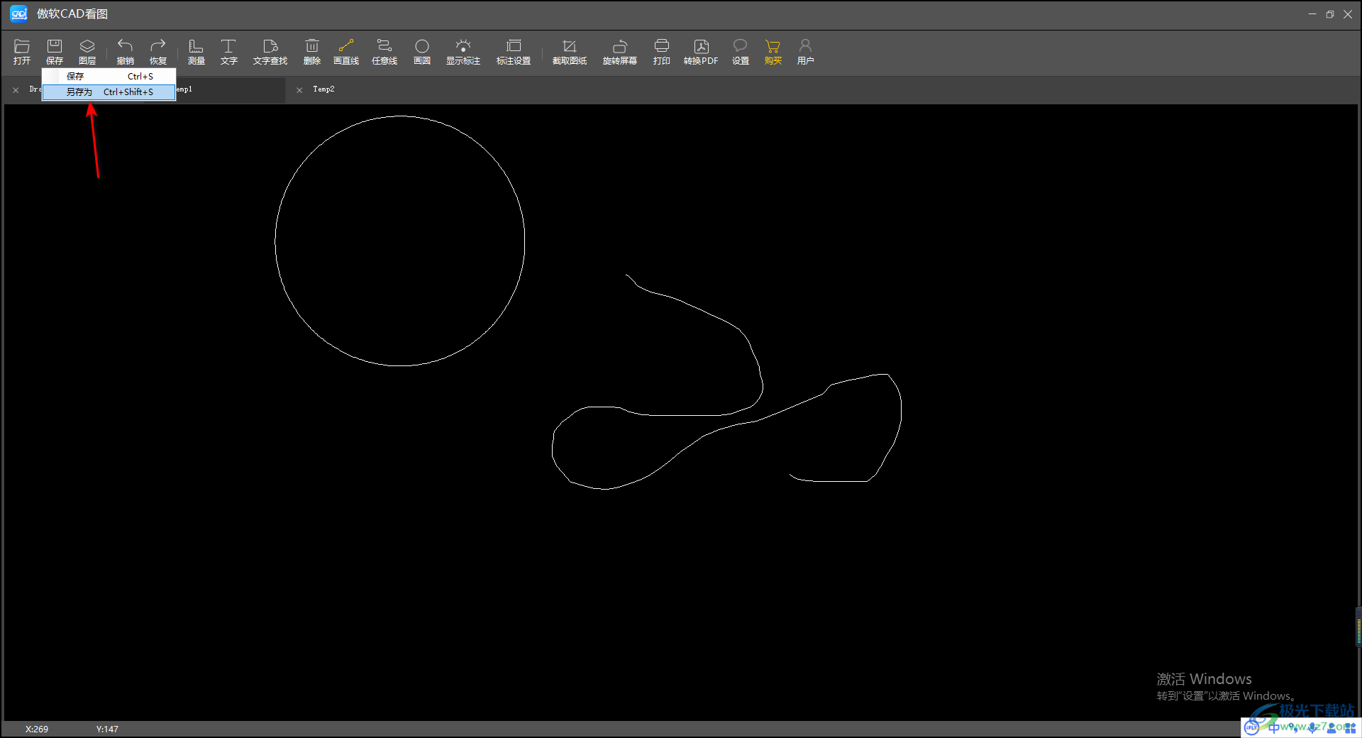2.想要将我们绘制好的图纸保存为图片的形式,那么我们需要进入到另存为的窗口中进行设置,点击左上角的【保存】按钮,在下拉选项中选择进入到【另存为】选项页面中。