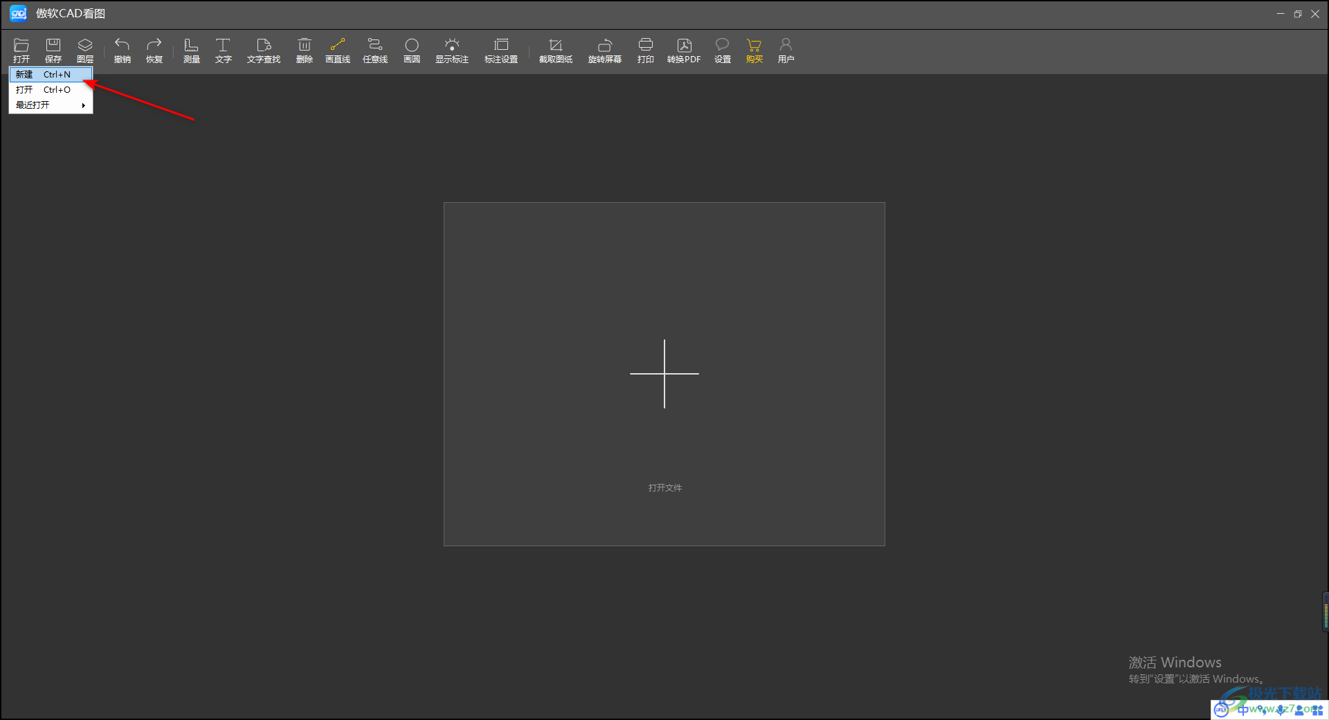 1.首先我们将傲软CAD看图双击打开,将左上角的【打开】按钮点击一下,在下拉选项中我们选择【新建】选项,新建一个CAD文件。