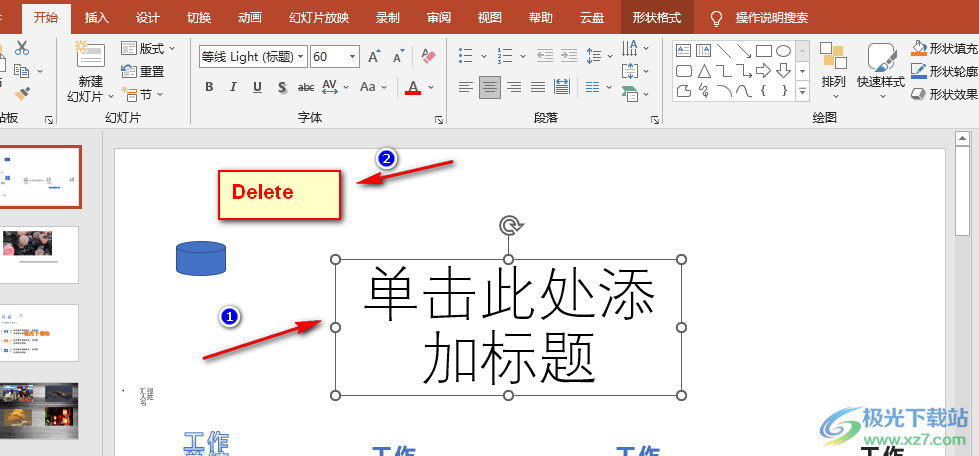 2、第二步,进入PPT页面之后,我们点击打开一页幻灯片,然后在幻灯片页面中点击选择需要删除的文本框,直接使用“Delete”键就可以删除文本框