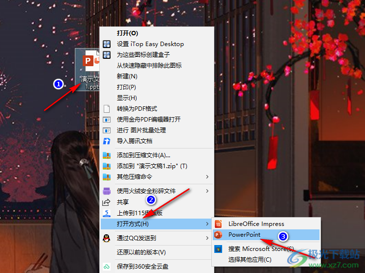 1、第一步,我们先在电脑中找到需要编辑的演示文稿,然后右键单击该文档选择“打开方式”,再在子菜单列表中点击“powerpoint”选项