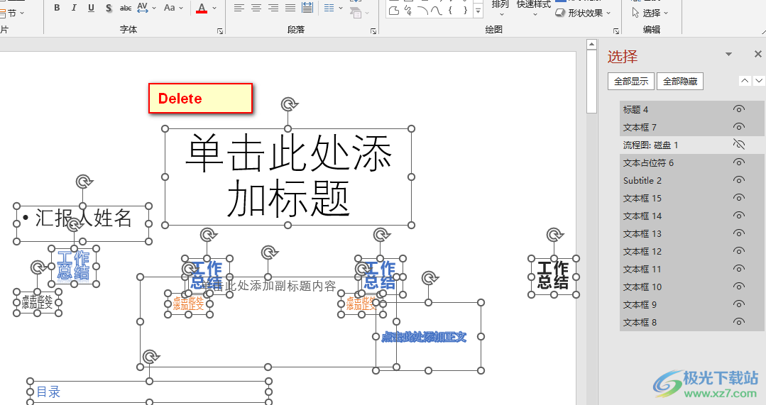 以上就是小编整理总结出的关于PPT删除文本框的方法,我们在PPT中选中单个文本框,然后点击“Delete”键就可以将文本框进行删除了,想要删除所有文本框,我们利用选择窗格将非文本框内容隐藏,然后使用快捷键全选文本框,最后点击“Delete”键即可,感兴趣的小伙伴快去试试吧。