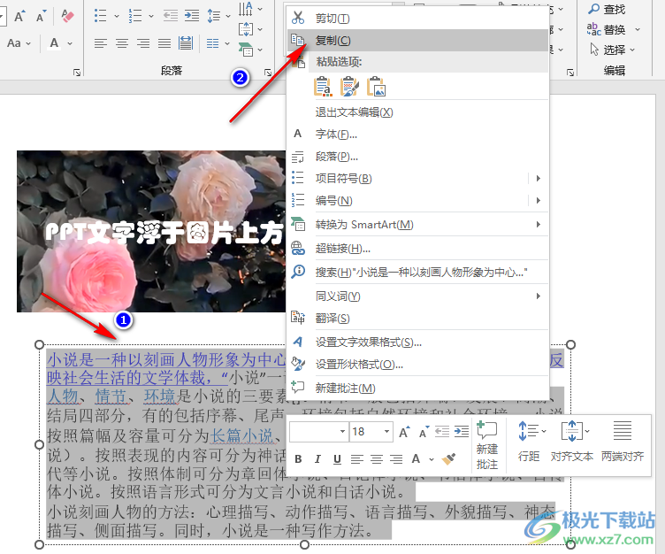 2、第二步,进入PPT页面之后,我们首先找到自己想要复制的内容,选中该内容,然后右键单击选择“复制”选项,或是直接使用快捷键“Ctrl+C”进行复制