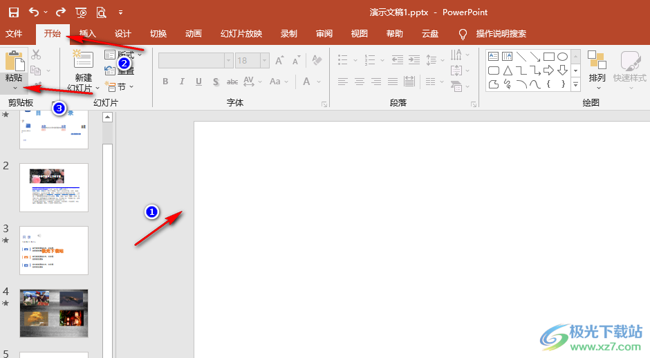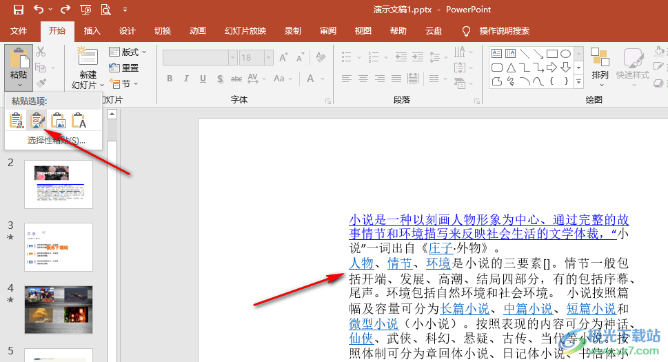 3、第三步,复制好之后我们打开一个需要粘贴该文字的幻灯片,然后在“开始”的子工具栏中打开“粘贴”选项下的箭头图标
