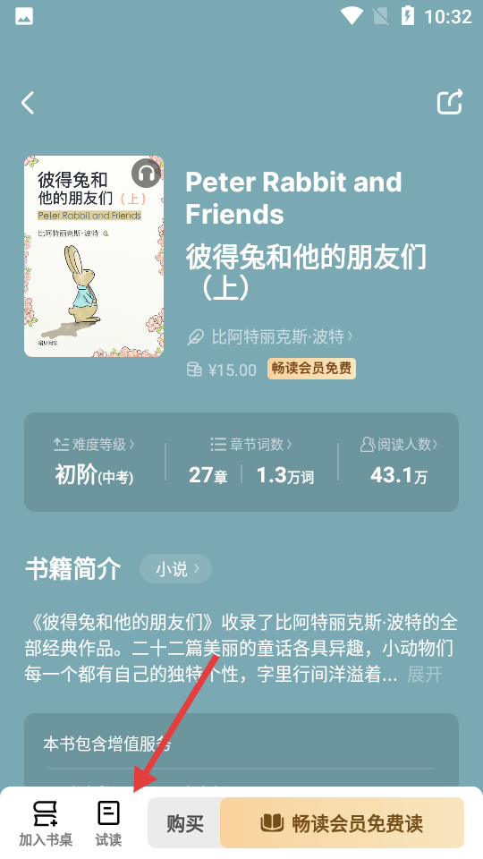 2、进入书籍详情页后点击【试读】,进入阅读界面。