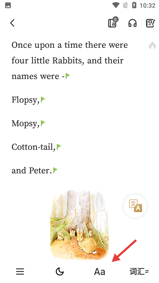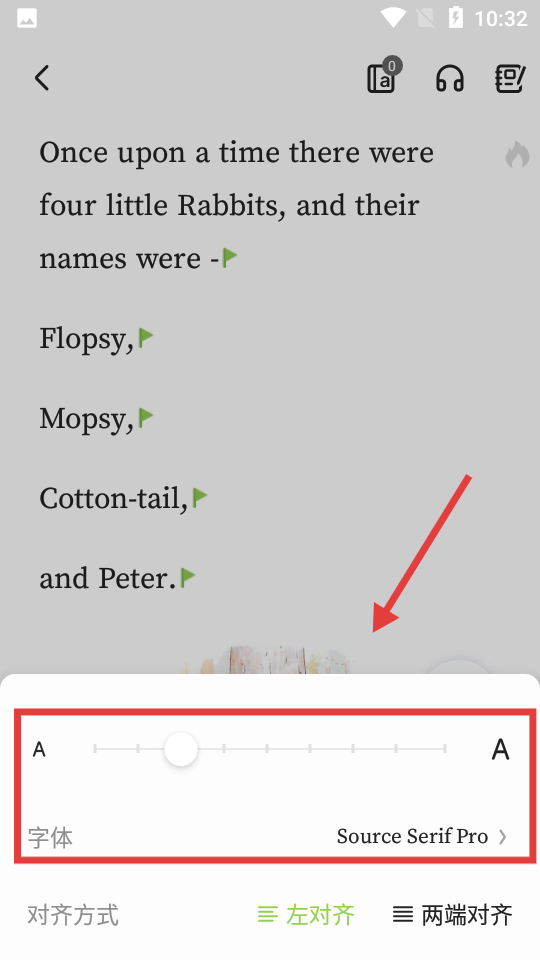 3、在阅读界面点击底部【Aa】字体设置按钮,弹出字体设置栏。