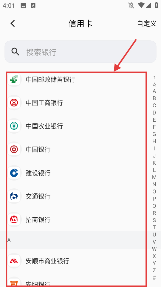 3、选择对应的银行(如中国邮政储蓄银行、中国工商银行等)。