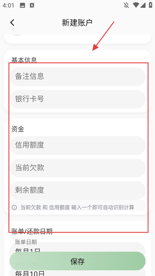 4、填写备注信息、银行卡号、信用额度、当前欠款等信息后,点击【保存】,完成银行卡添加操作。