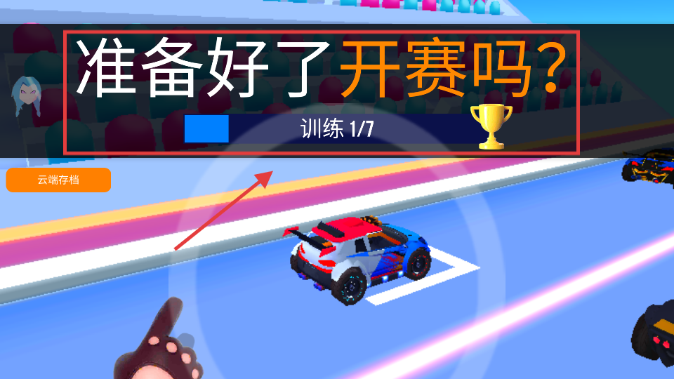 1、赛前需确认训练关卡进度为【训练1/7】,做好开赛准备,通过训练赛提升技巧,赢取奖杯与金币,为后续改装爱车积累资源。