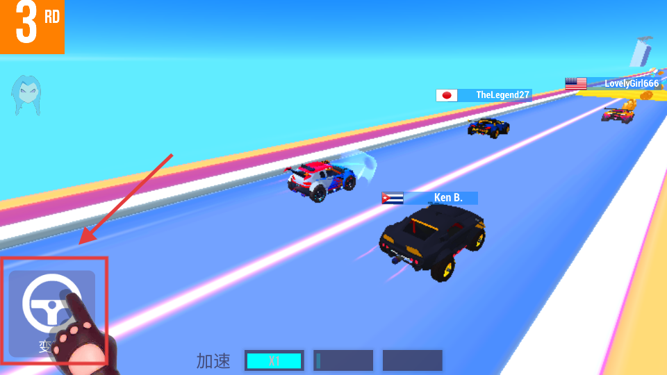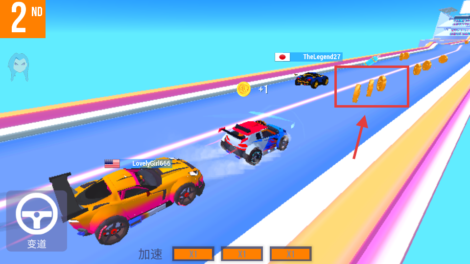2、比赛中点击左下角【变道】按钮可调整车道,需把握时机变道,避开对手或超越前车,提升比赛排名。