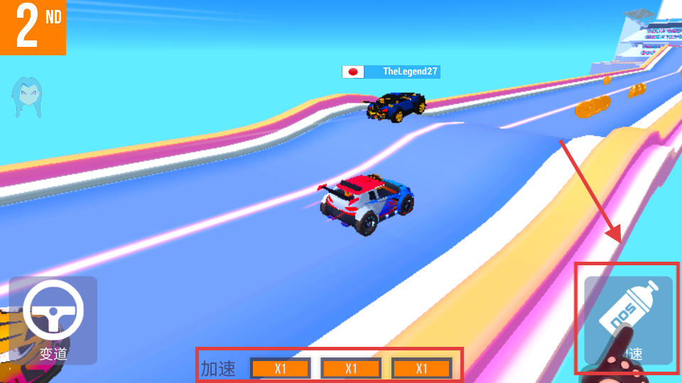 4、比赛时可点击底部【加速】按钮(含多个【X1】)提升速度,同时在合适时机点击右侧【NOS】道具,短时间内大幅加速,助力超越对手。