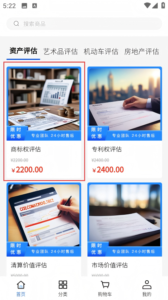 1、商品分类功能:将不同类型的资产评估商品分类展示,帮助用户快速定位所需商品,提升选购效率。
