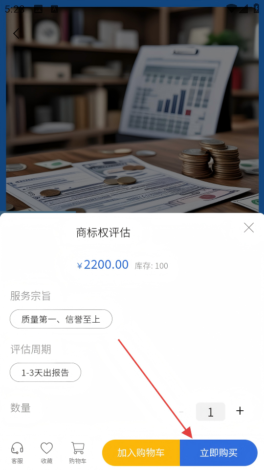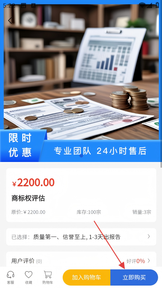 2、进入商标权评估服务详情页后,点击【立即购买】按钮。