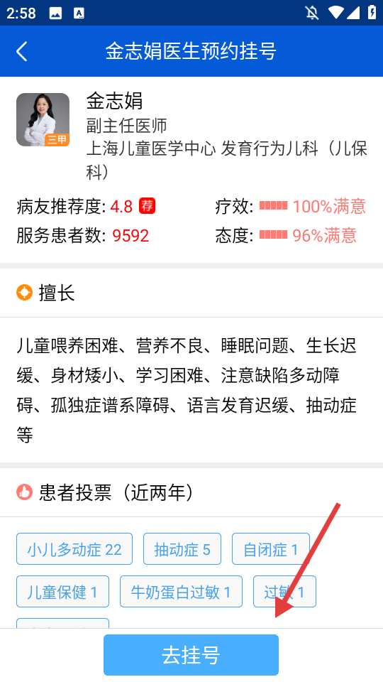 4、可查看医生信息,点击【去挂号】,完成预约挂号操作。
