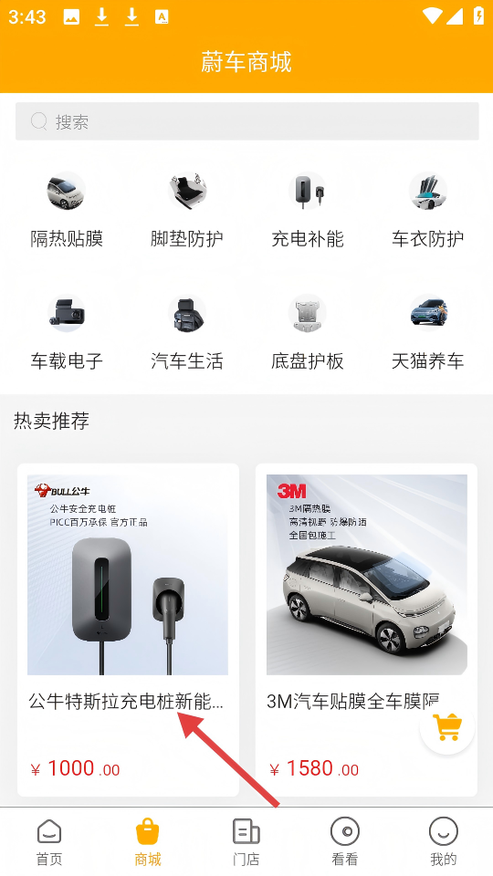 2、在蔚车商城页面,点击【公牛特斯拉充电桩新能源…】的商品卡片,可进入该商品的详情页面。