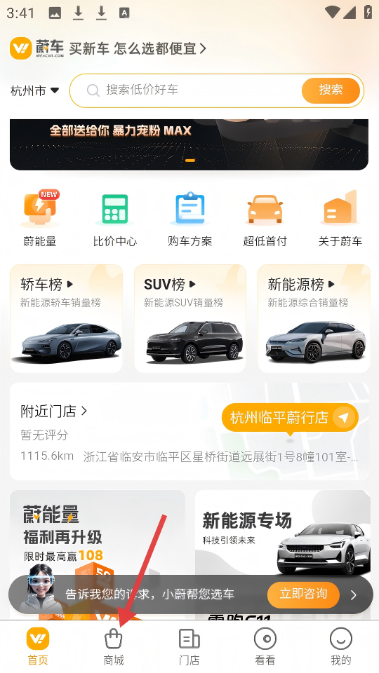 1、在首页点击底部【商城】按钮,可进入蔚车商城页面。