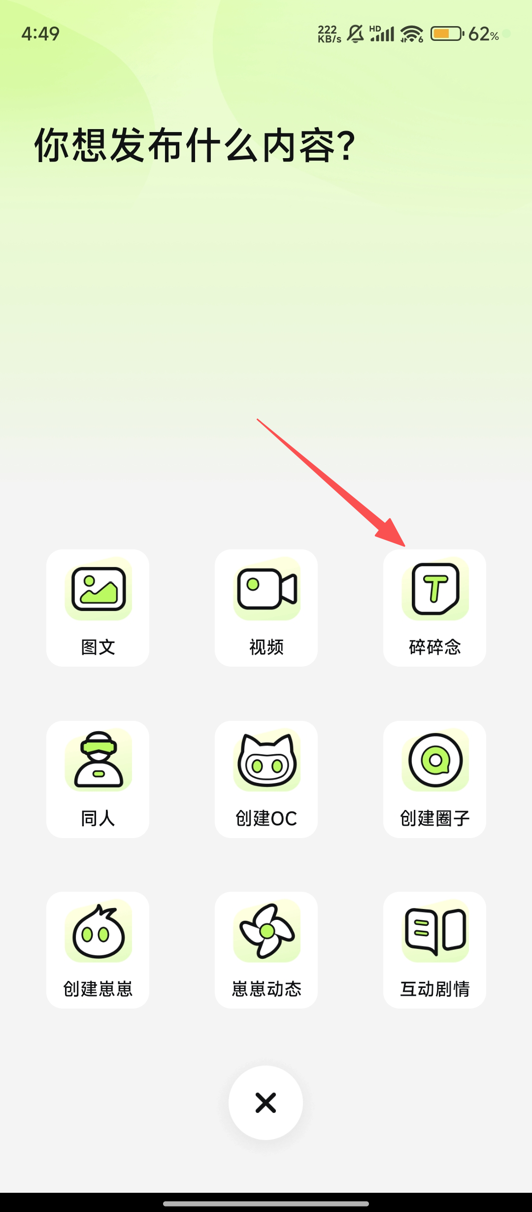 2、在发布内容选择界面,点击【碎碎念】,进入发布动态页面,准备分享灵感情绪呢。