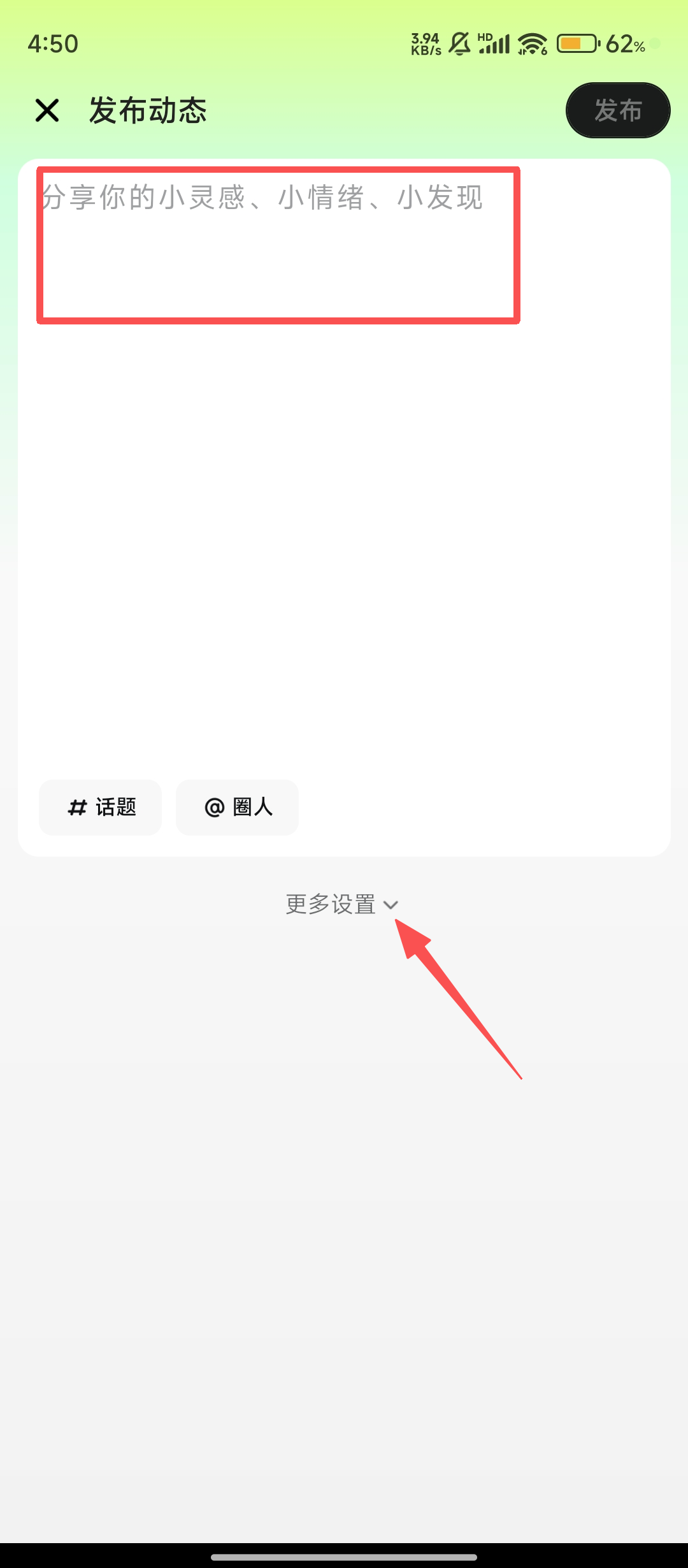 3、在发布动态页面,填写内容后,点击【更多设置】,可以进行更多发布选项的配置哦。