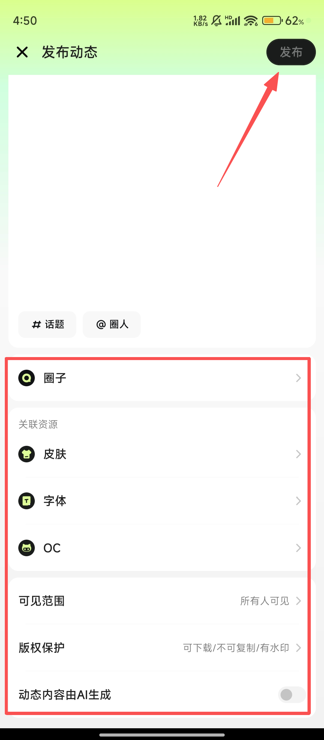 4、在更多设置中配置好圈子、皮肤等选项后,点击【发布】,就能成功发布动态啦。