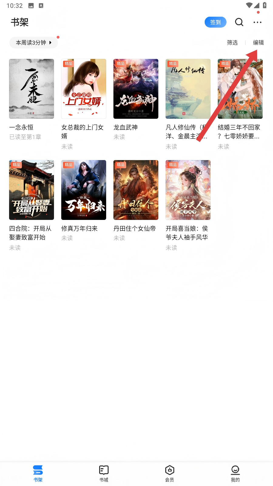 2、在书架页面,点击右上角【编辑】按钮,进入书籍编辑状态呢。