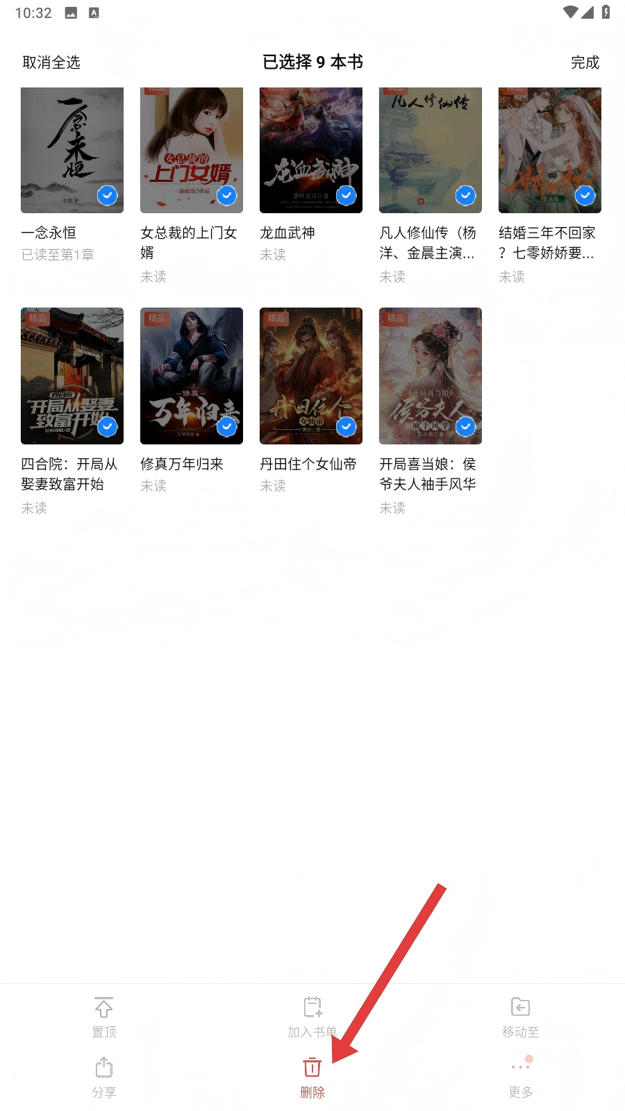 3、进入编辑状态后,选择要删除的书籍,点击底部【删除】按钮,准备移除书籍哦。