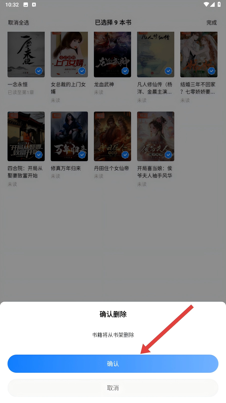 4、在弹出的【确认删除】弹窗中,点击【确认】按钮,即可将选中的书籍从书架删除啦。