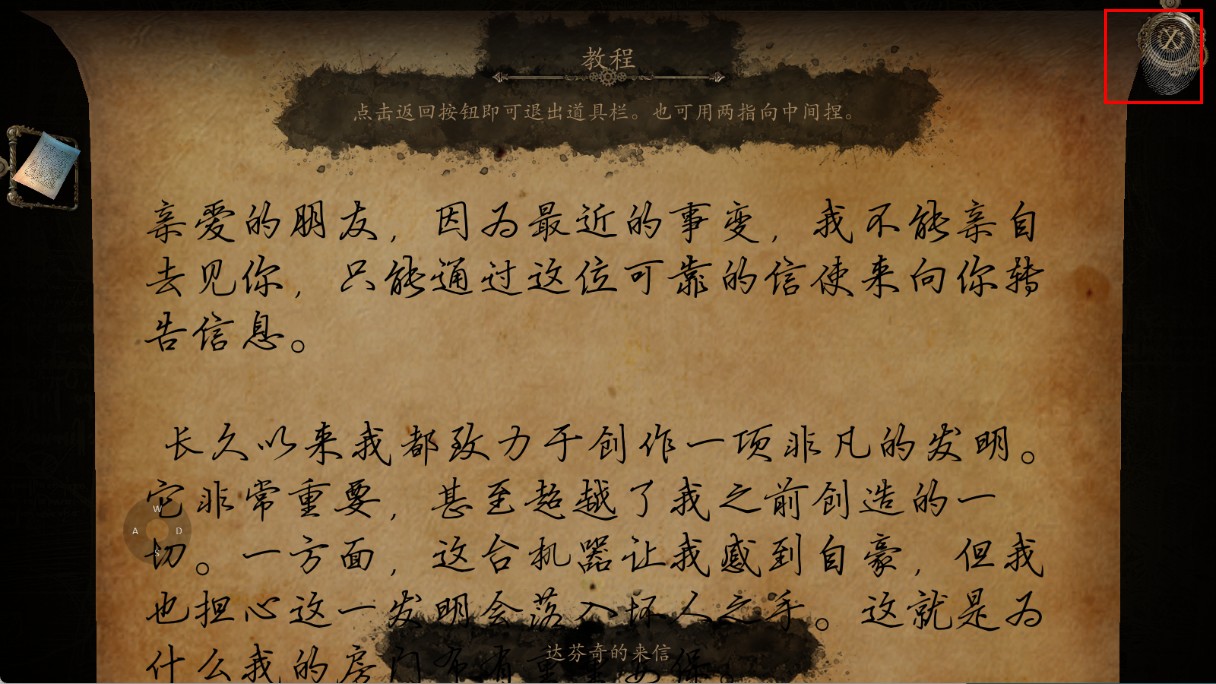 4、查看卷轴内容后,可点击返回按钮退出道具栏,继续游戏探索。