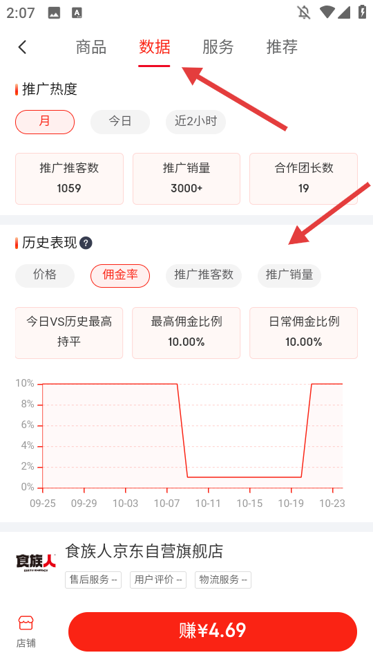 4、点击【数据】板块,可查看推广热度、历史表现等数据信息。