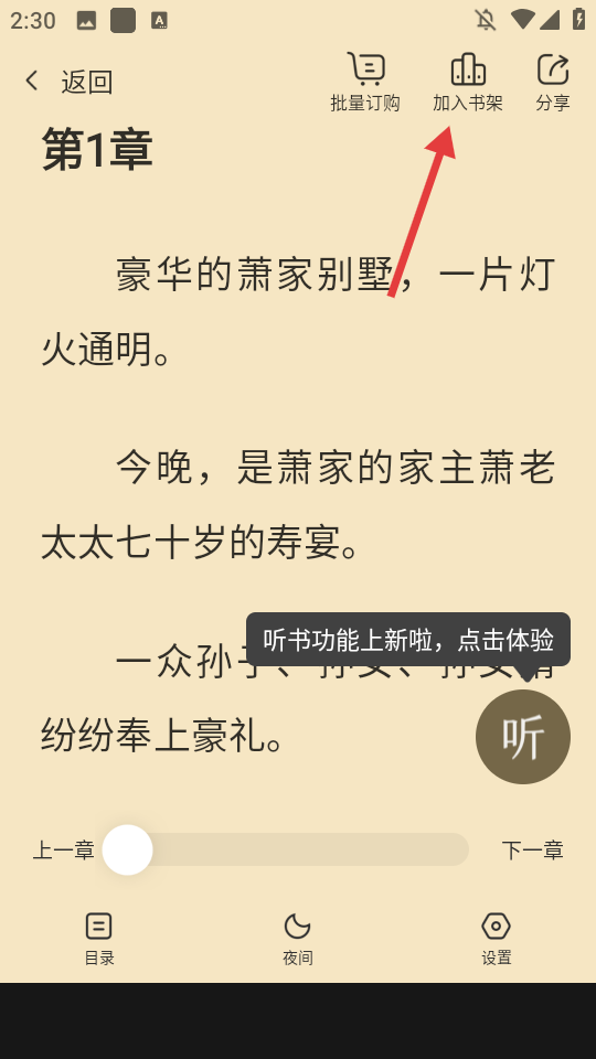 4、进入小说阅读界面后,点击右上角“加入书架”按钮。