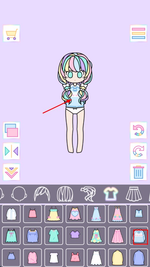 1、基础装扮操作:点击服装柜选择喜欢的上衣,然后搭配相应的下装和鞋子,最后添加发饰完成整体造型。