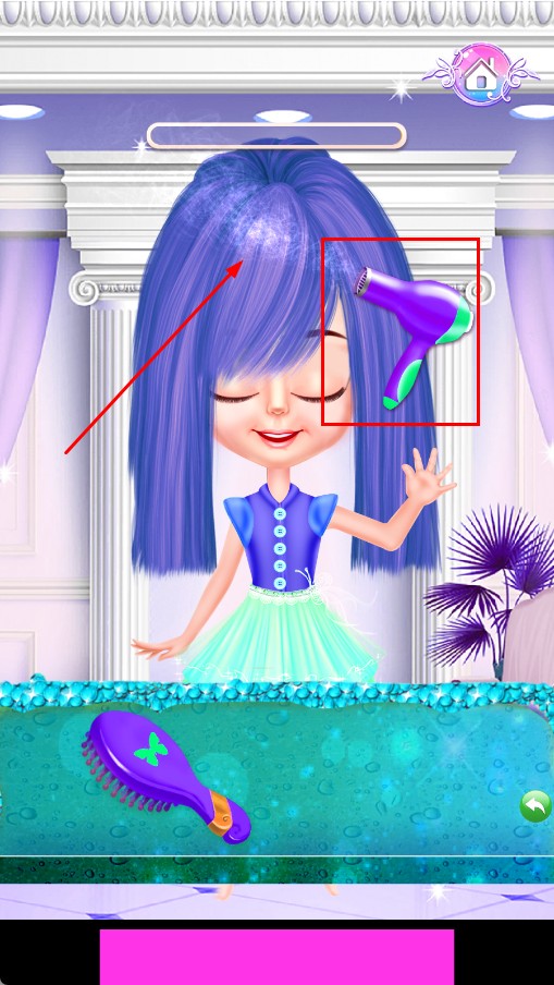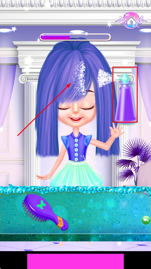 2、选紫色洗发类道具,涂抹头发,为后续美发做准备。