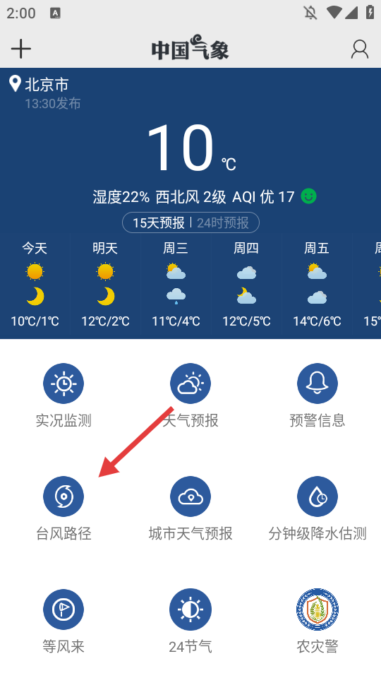 1、打开中国气象APP,点击【台风路径】功能入口。