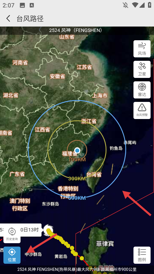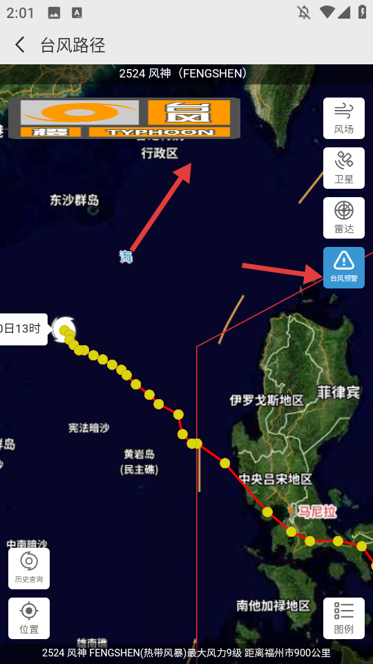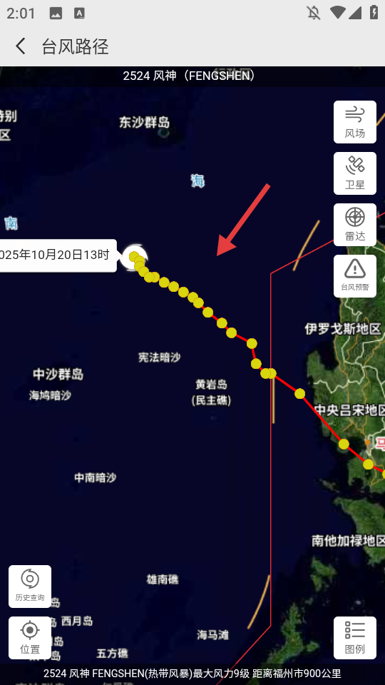 2、在台风路径界面,可查看台风实时位置、移动路径。