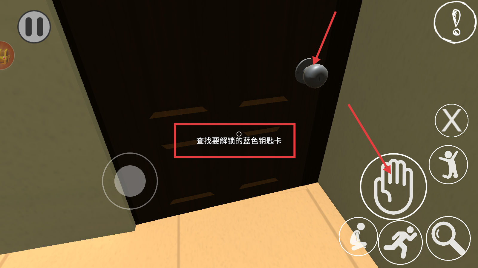 4、根据提示【查找要解锁的蓝色钥匙卡】,找到后点击【手型】图标互动开门。
